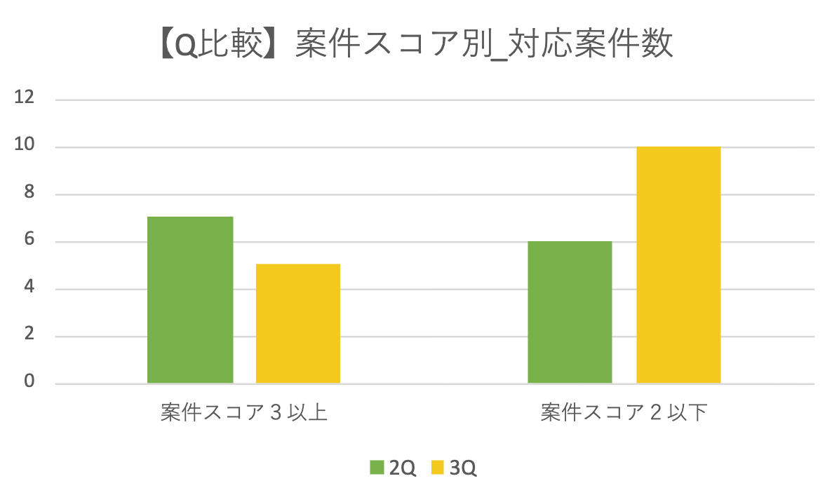 2Qにおいては案件スコアの大きい(即ち規模が大きく、複雑な)案件が多かったのに対し、3Qにおいては比較的案件スコアの小さい(即ち規模が小さく、単純な)案件の開発が多かったことが見受けられます。